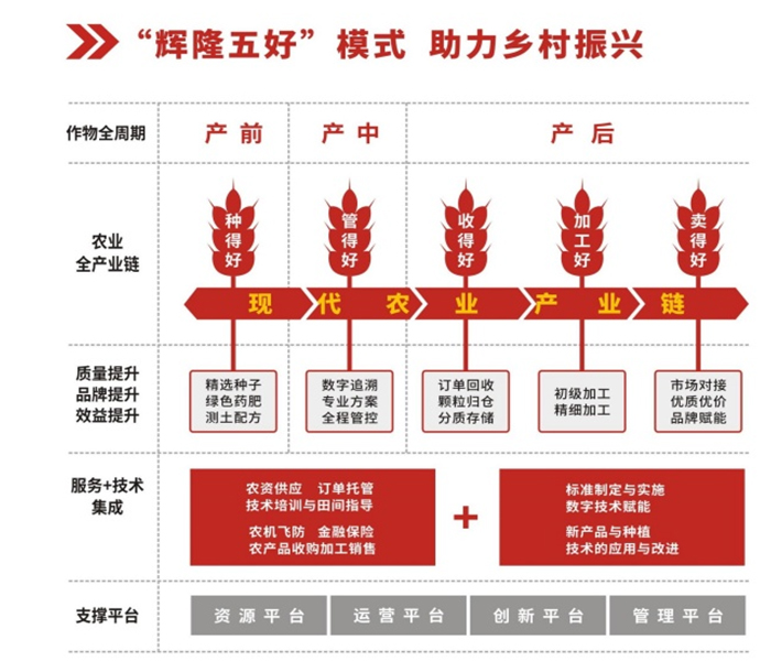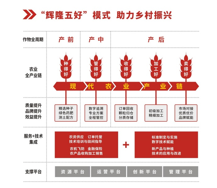 農(nóng)業(yè)社會化服務(wù) 集團秉持服務(wù)“三農(nóng)”,奉獻(xiàn)社會的宗旨,旗下輝隆股份以“種得好、管得好、收得好、加工好、賣得好”“輝隆五好”模式為鏈栓,把農(nóng)業(yè)種植端和市場需求端連接起來,有效解決農(nóng)業(yè)生產(chǎn)中的實際問題,確保糧食顆粒歸倉和種植者的收益。把打造“一站式現(xiàn)代農(nóng)業(yè)綜合服務(wù)平臺”作為首要工作,通過農(nóng)業(yè)應(yīng)用技術(shù)升級、智慧農(nóng)業(yè)數(shù)字系統(tǒng)賦能,實現(xiàn)種植、管理、收儲、加工過程的標(biāo)準(zhǔn)化和可追溯,融合農(nóng)業(yè)保險等其他社會化服務(wù)組織,完善農(nóng)業(yè)綜合服務(wù)功能,助力”藏糧于技,藏糧于地”的國家戰(zhàn)略實施,在鄉(xiāng)村振興中彰顯社有企業(yè)的責(zé)任和擔(dān)當(dāng)。